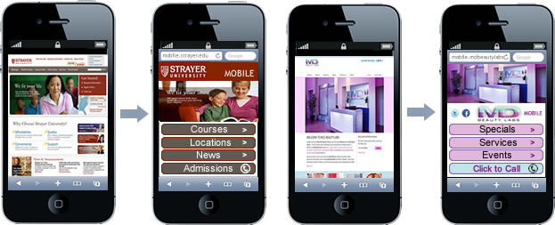 | Mobile Web Development Having a mobile presence is no longer a luxury; it is a necessity. Millions of people are using mobile devices to get online every day. Just because you can see your desktop site on a mobile phone doesn't mean it's mobile-friendly. Mobile sites are designed for the small screen, with the needs of mobile users in mind. A mobile-friendly site can help your business connect with customers and drive conversions in real-time. Let us help you get there today. |